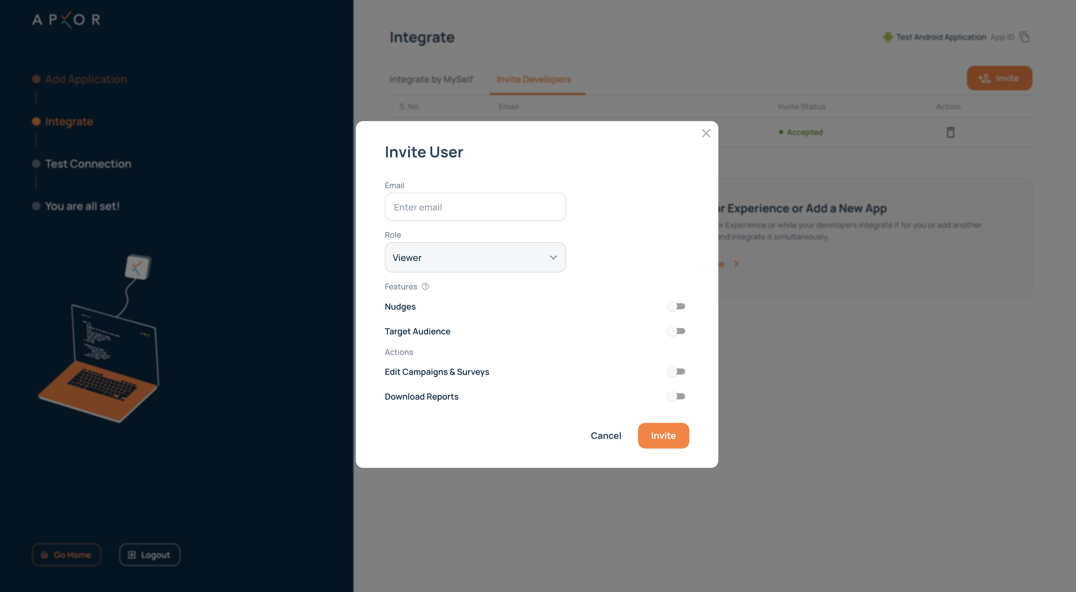 The organisational owner will have the privilege to add developer by clicking on **InviteDevelopers > Invite** and by entering the developer email id.