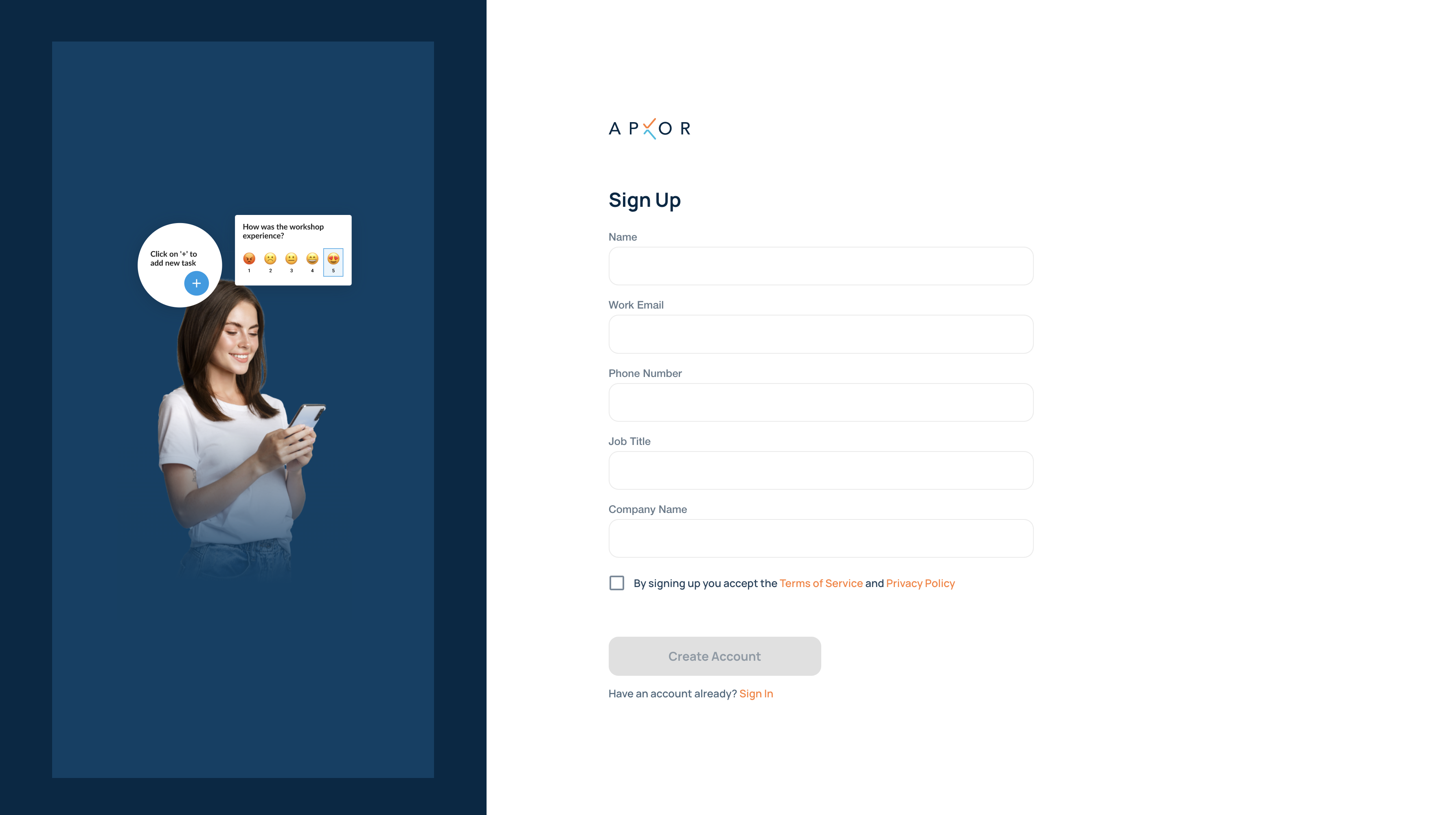 Enter your name, work email, phone number, job title and company name on the sign-up page. The company name you enter here will be displayed as the Organisation Name in the Apxor Dashboard.