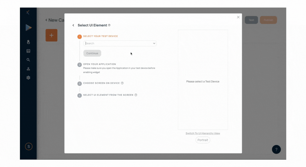 You will need to select a test device for the templates that will anchor to a UI element. Search and select your device name. If your device is not registered already, [follow the steps here to get it registered](https://guides.apxor.com/product-guides/adding-a-test-device). Open the application on your test device. Click on “Enable Widget”. Then you will see the Apxor logo on the top center of your test device screen. Click on that logo, then click on "**Select this screen**".