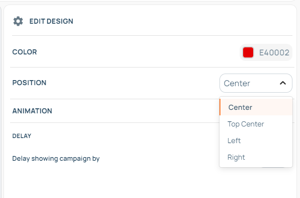 The Simple Badge Legacy template is a small circular dot that can be positioned at the Left, Right, Top Center and Center of the UI element. You can also change the color of the dot. You can enable animation for the dot, which is a slight up-and-down motion for the dot. You can select the number of seconds to delay the campaign being shown after the trigger condition is met.