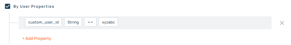 You can target users based on their User properties. User properties include unique user identifying information, such as their name, phone number, signup date, etc. You can select the user property Name, Data Type (whether it is a String, Numeric or Decimal), the logical operator, and the Value.