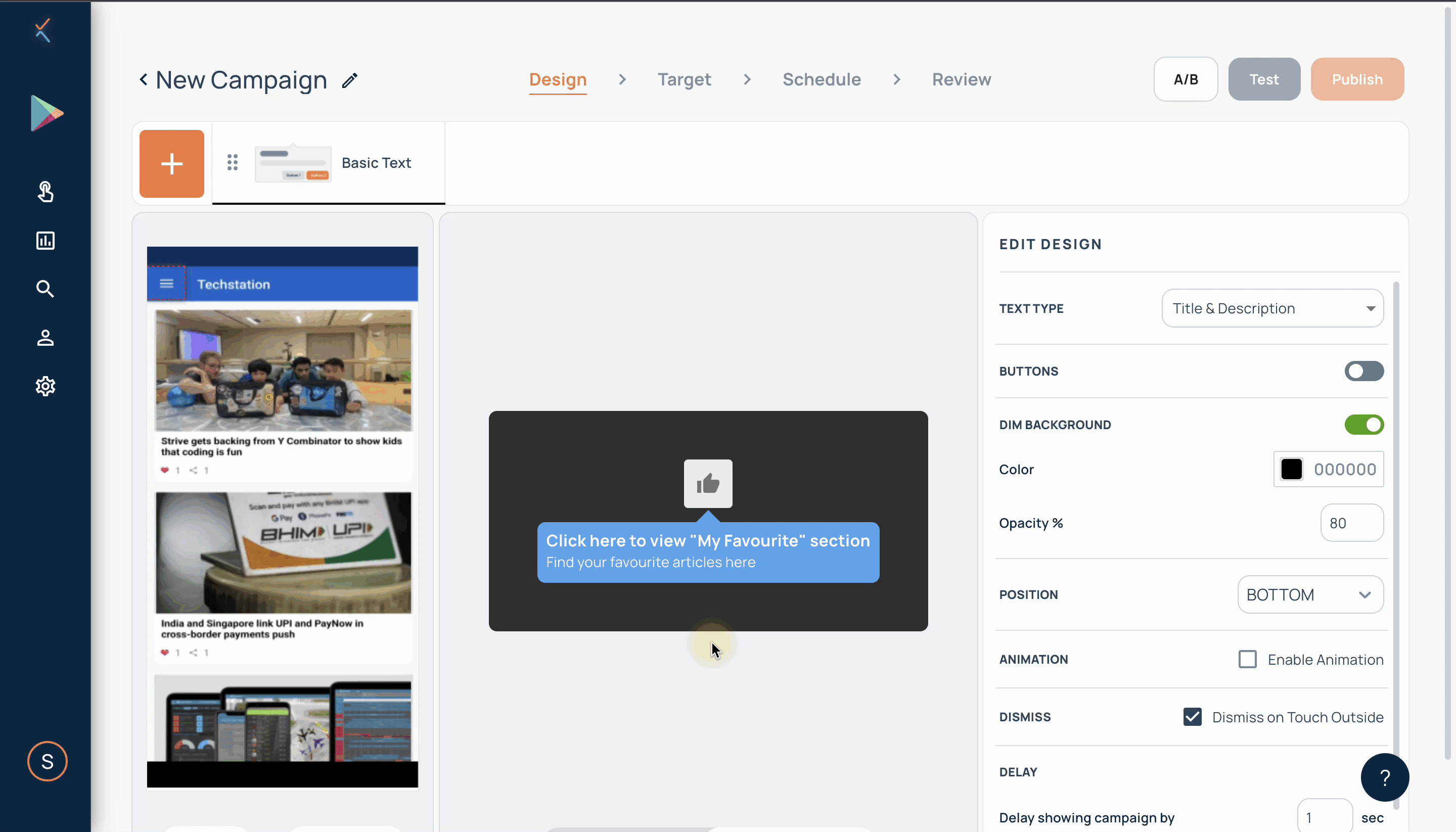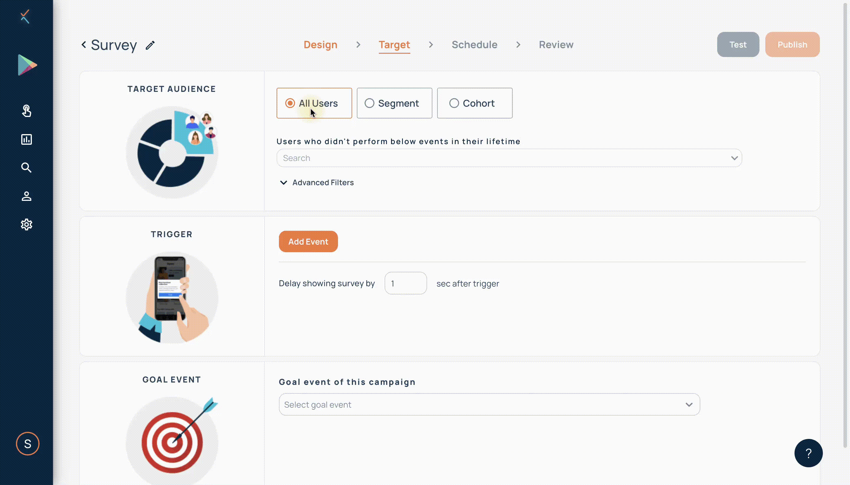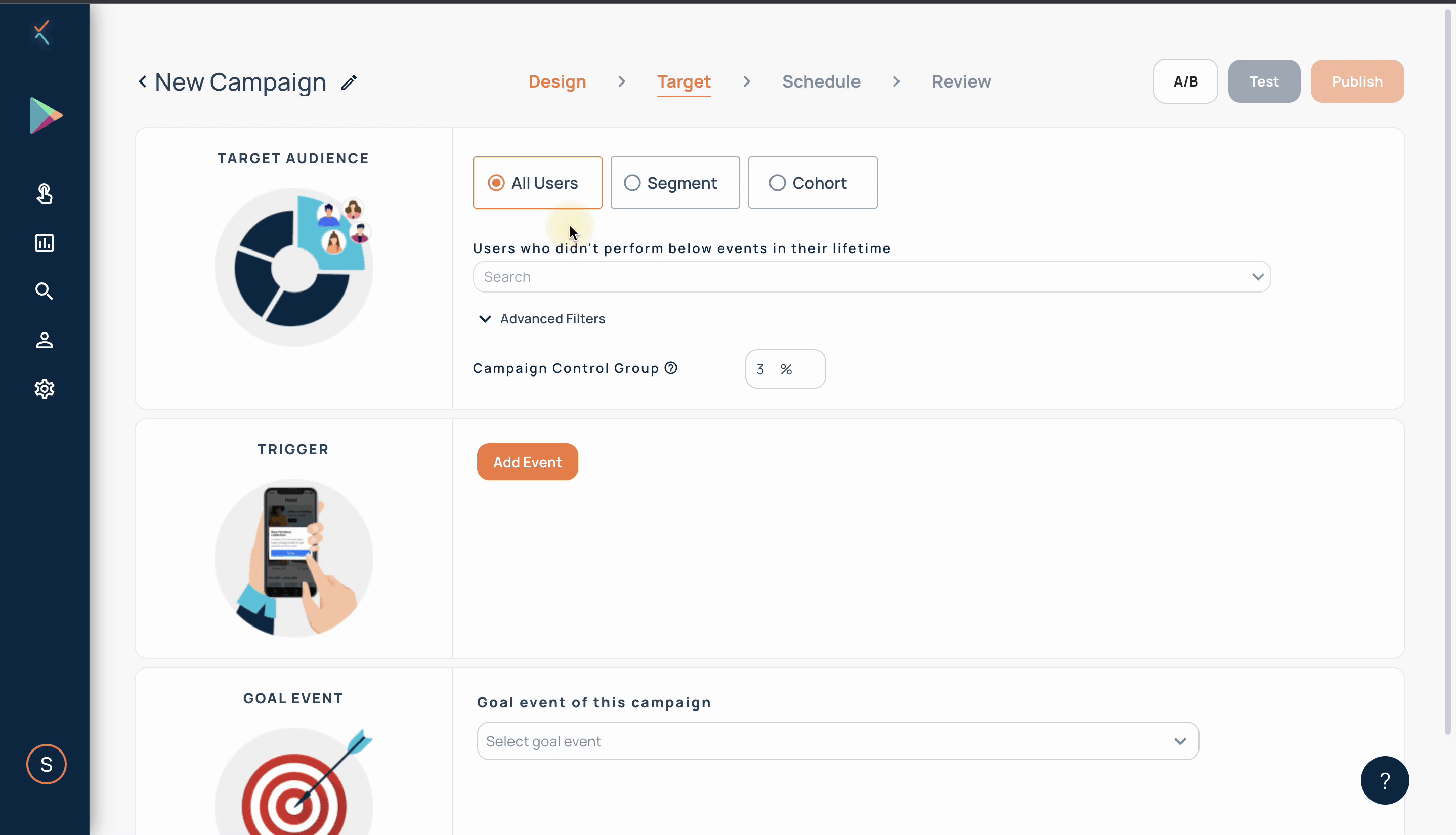 Start by selecting your target users – whether you want to aim the campaign to “All Users”, “Segment” of Users, or “Cohort” of users.